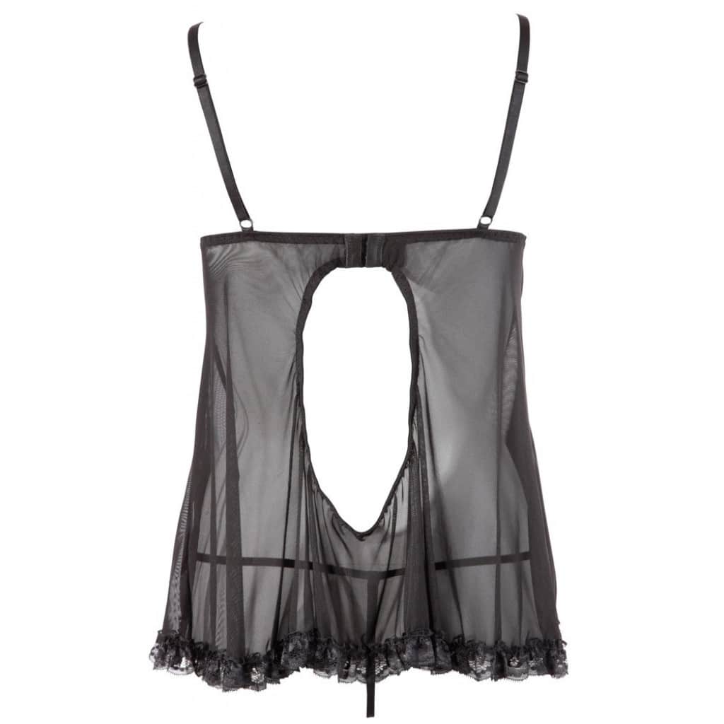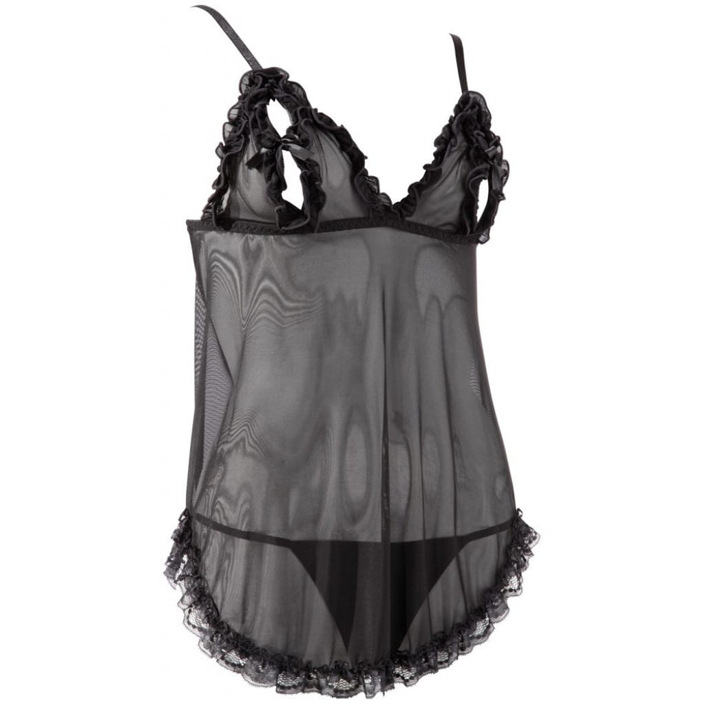 Cute ruffled black babydoll with open cups that close with small bows and at the back with hook closure. The cut out at the back gives a mysterious look to the lingerie.