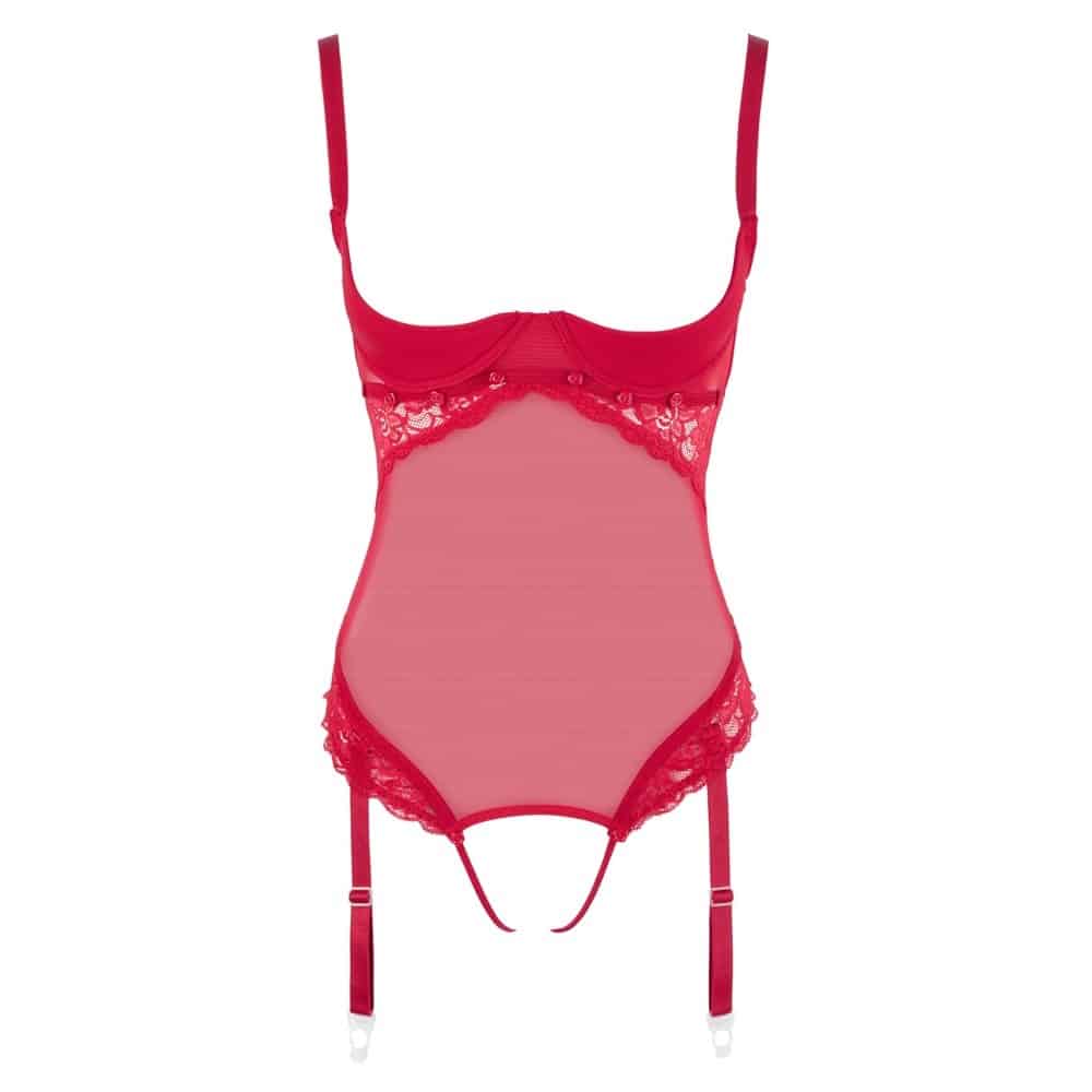 Stunning body that can be worn in four different ways!vRed body made out of soft, stretchy powernet and delicate lace. The lace cups and one pair of straps can be removed, leaving only a shelf bra. All four straps are adjustable. The string part with cotton gusset can also be detached – there only remain stretchy straps over the open crotch. At the front with two adjustable and removable suspender straps.