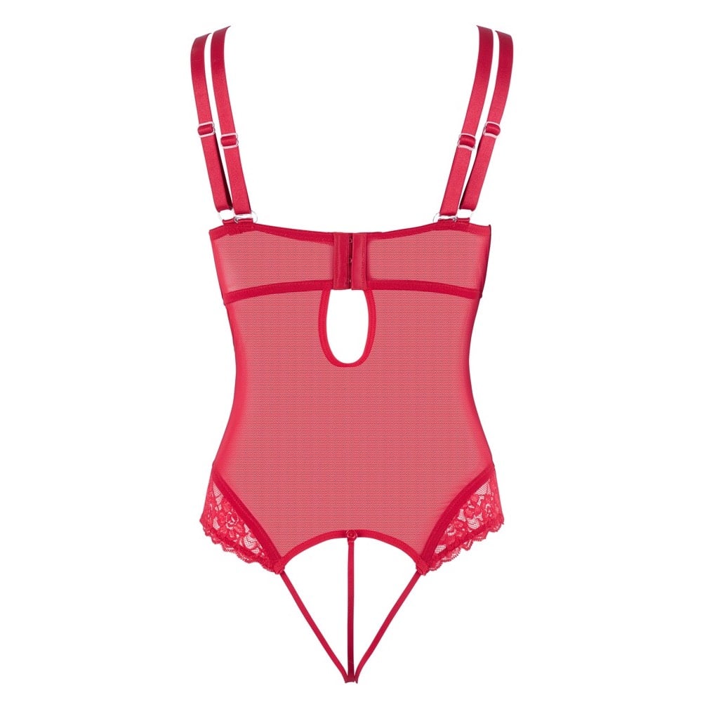 Item number: ETET-26420263231Stunning body that can be worn in four different ways!vRed body made out of soft, stretchy powernet and delicate lace. The lace cups and one pair of straps can be removed, leaving only a shelf bra. All four straps are adjustable. The string part with cotton gusset can also be detached – there only remain stretchy straps over the open crotch. At the front with two adjustable and removable suspender straps.