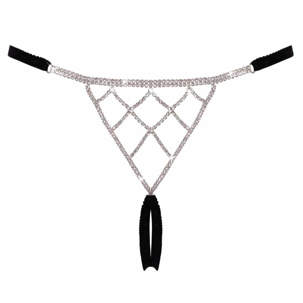 Elevate your intimate wardrobe with this premium rhinestone-embellished open string by Cottelli LINGERIE. This provocative piece is engineered from ultra-stretchy, soft-touch black strapping to ensure a flexible fit across various body types. The aesthetic is defined by its brilliant silver hardware and dual decorative triangles, which serve as a canvas for a dense arrangement of sparkling crystals.
