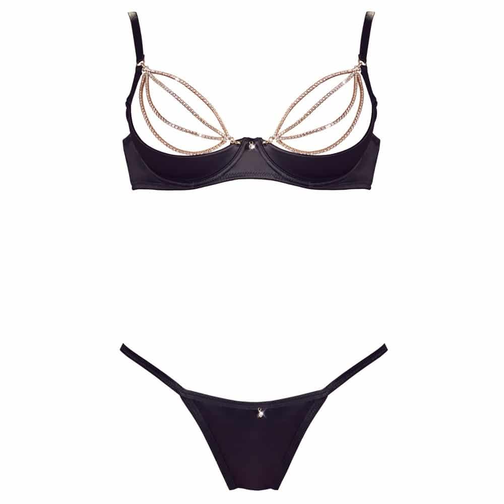 Item number: ETET22211791231Pure luxury by Cottelli! A beautiful lingerie set made out velvety soft satin. The slightly padded shelf bra frames the breasts with 3 gold-coloured rhinestone chains over each breast. The string is also accentuated with 3 rhinestone chains over the buttocks. All chains can be removed.