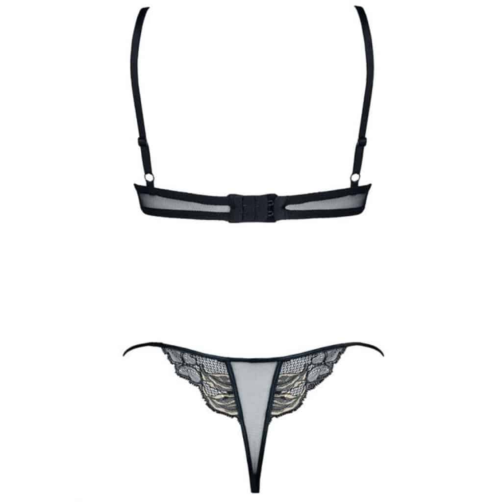 The impressive thongs which are part of the set in a sexy way highlight the roundness of the buttocks and give them an alluring character. The translucent thong with elegant black and gold lace details.