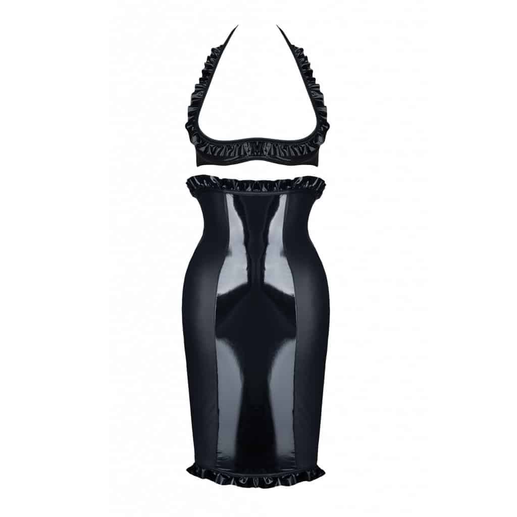 Item number: ETETKODAN001Demoniq Danika shiny, wetlook medium long dress with high waistline and matching open cup bra is a pure invitation for naughty play.