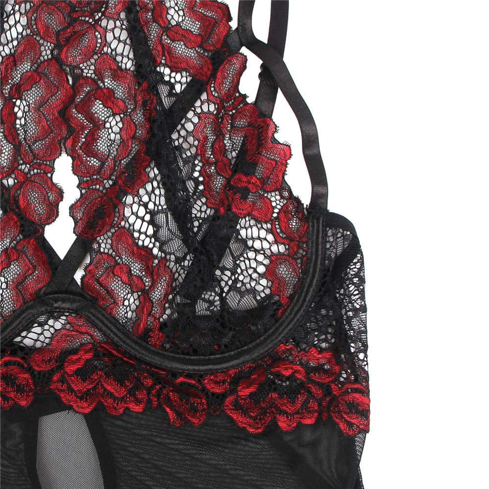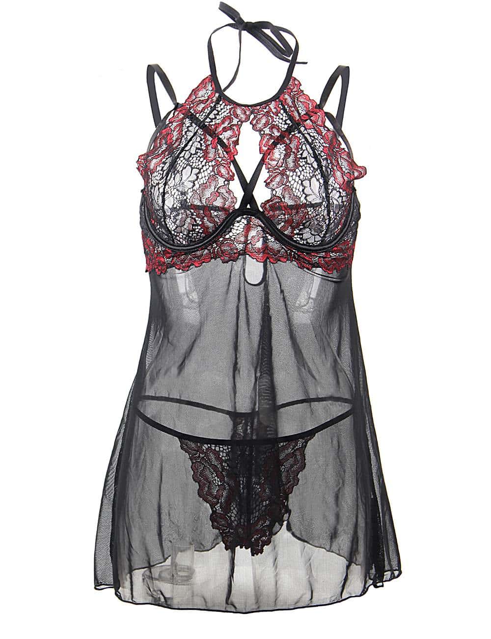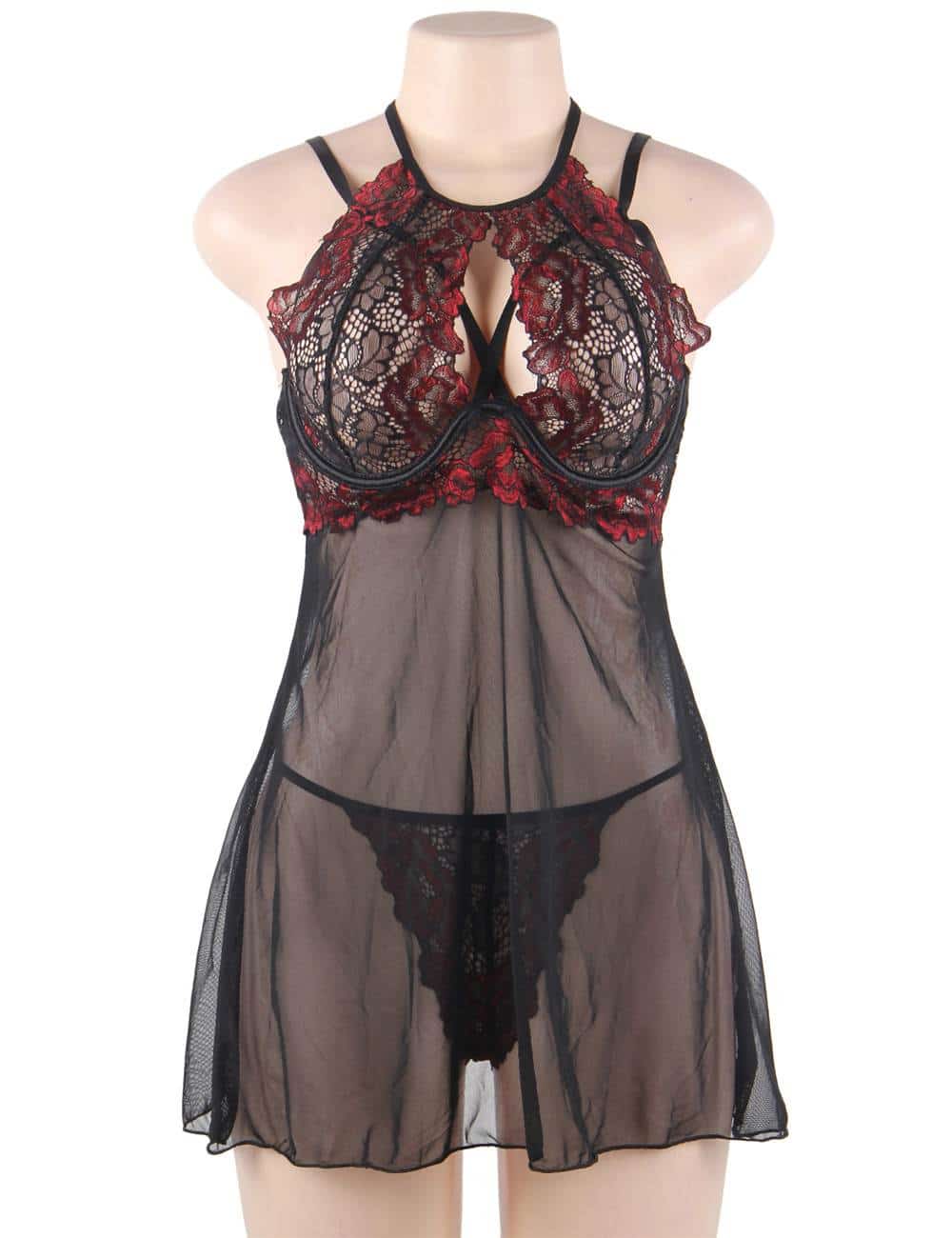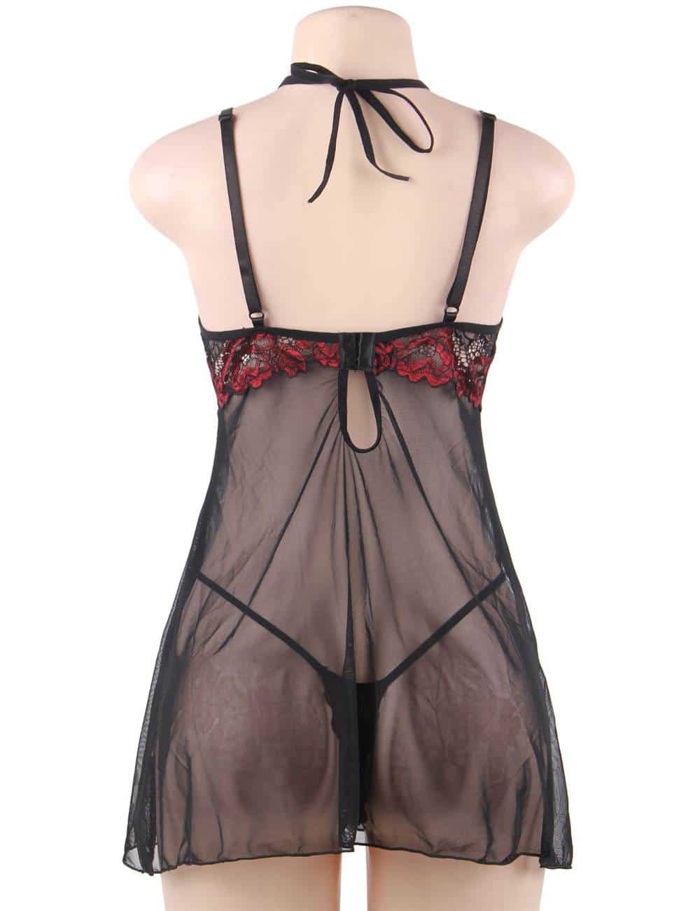 Mysterious Babydoll with String set. Black tulle chemise with floral lace cups and matching string to complete your evening look.Black tulle chemise with floral lace cups and matching string to complete your evening look.