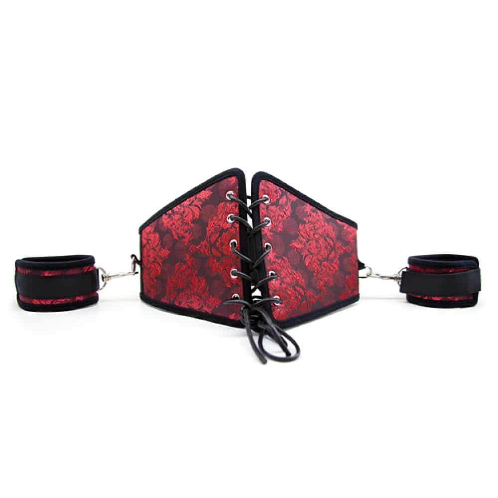 Delight your lover with this Corset with hand cuffs! Your true beauty will shine in this red corset and its matching hand cuffs. The gorgeous black lace-up closure give a royal energy when worn, and the adjustable padded hand cuffs keep you submissive to your lover in comfort. The plushy, removable hand cuffs can be attached to the side of the corset for all kinds of rough play! The velcro enclosures on the hand cuffs allow easy restraint and release, while the hand cuffs hook to the corset with universal clips that make re-positioning and toy play quick and easy. Explore the world of bondage and power exchange, deepening trust and intimacy with your lover as you place the pleasure in each others hands knowing you cannot break free! Surrender to the whims of your dominant and enjoy the exhilaration of surrender with this sexy scandalous set!