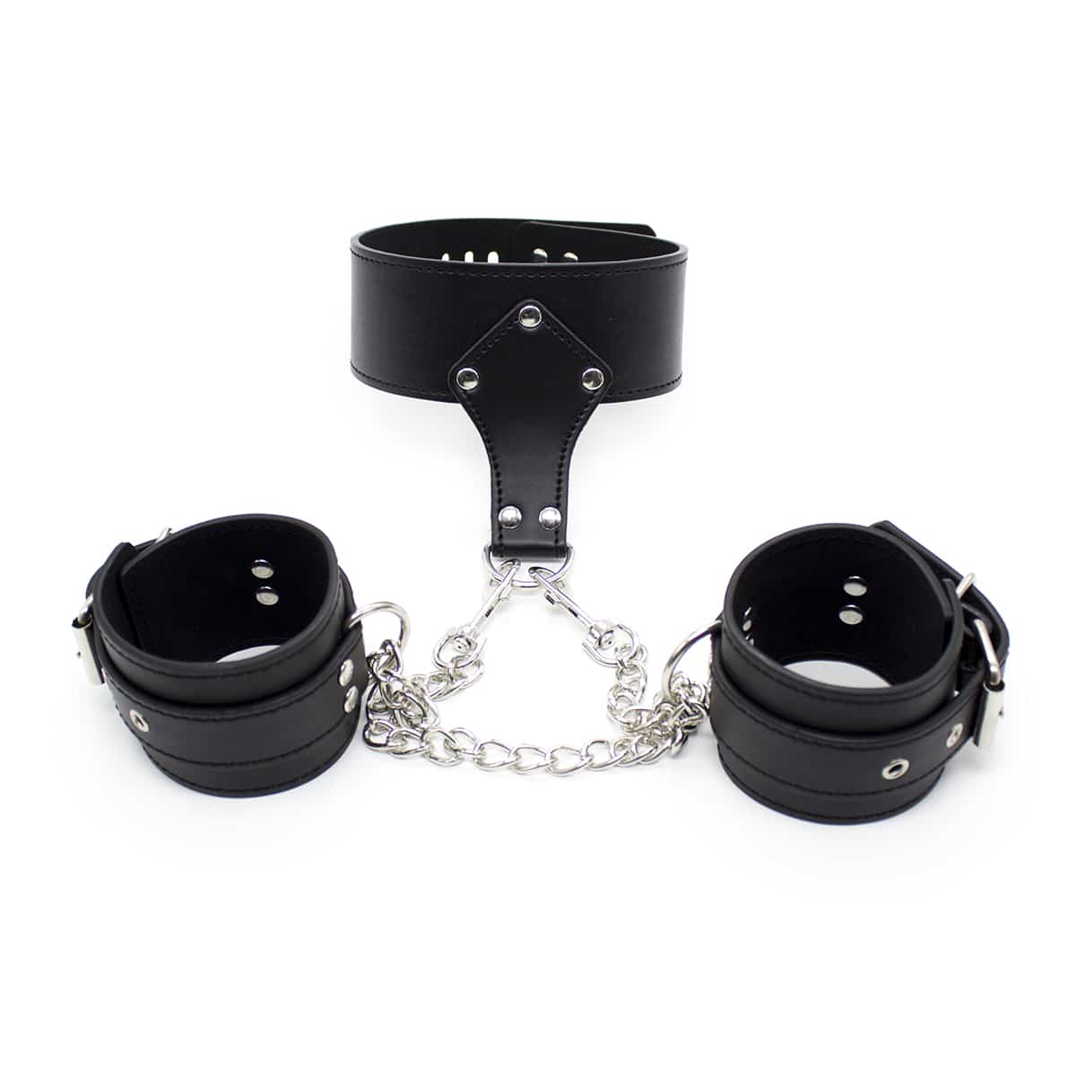 Item number: 262402028Quality BDSM Bondage set made out of PU Faux Black leather metal chained Handcuffs. Beginner to advanced Bdsm Dominance and slave submission bondage restraint Kit. This leather Studded Collar and handcuffs set gives you everything to need to keep your partner at bay, so you can have your way with them. Collar and cuffs connect with a metal chain. Please see photos.
