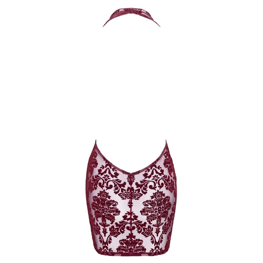 Make a statement with this stunning short dress crafted from luxurious burgundy flocked tulle. Designed to combine bold allure with refined sophistication, it’s perfect for captivating and unforgettable evenings.