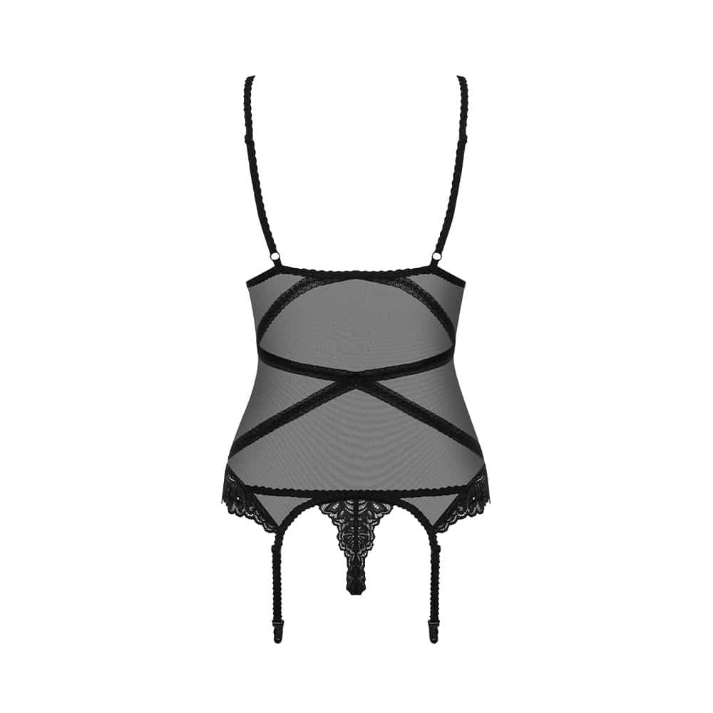 Item number: ETET-BONDEAElegant black basque set from Obsessive lingerie line. The must have evening wear for every women. This set includes a translucent mesh corset with charming lace cups and matching string. Perfect combination of mesh, floral lace and straps – worth the sin!