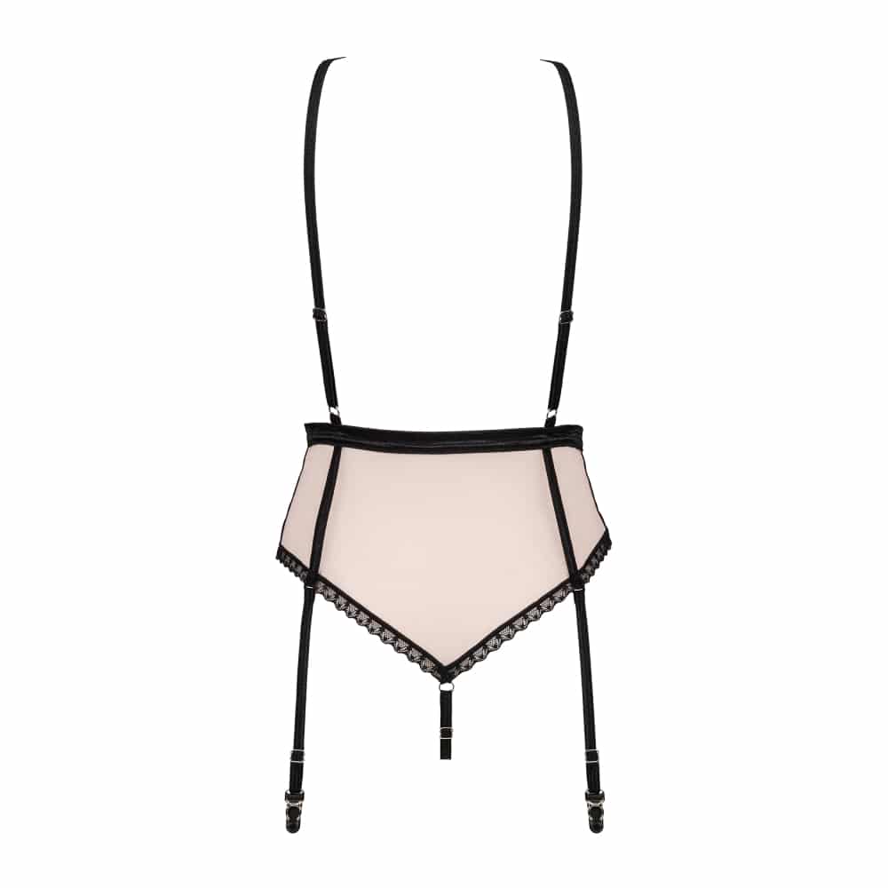 Lace teddy in combination with a matching garter belt. Pale pink lace and contrasting black fabric inserts emphasize feminine shapes. The delicate, floral pattern will add elegance, and the deep neckline and exposed back will ensure a sexy look. Jewellery pendants on the neck and stomach will make a stylish accessory. Detachable garter straps will allow you to wear teddy in two ways.