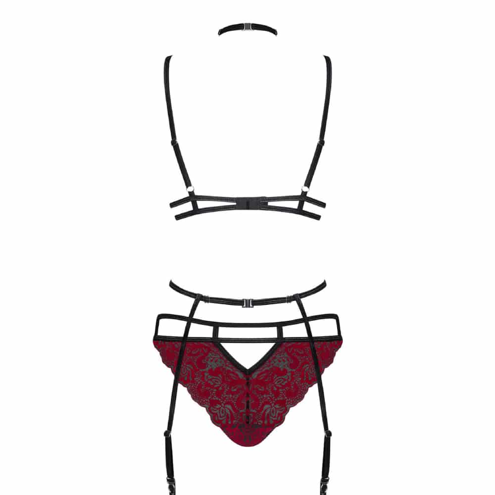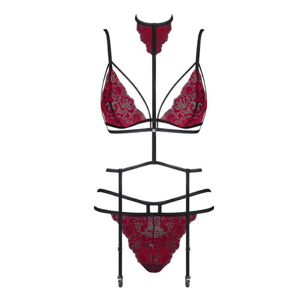 - beautiful bra, garter belt with a choker, and panties with a unique design