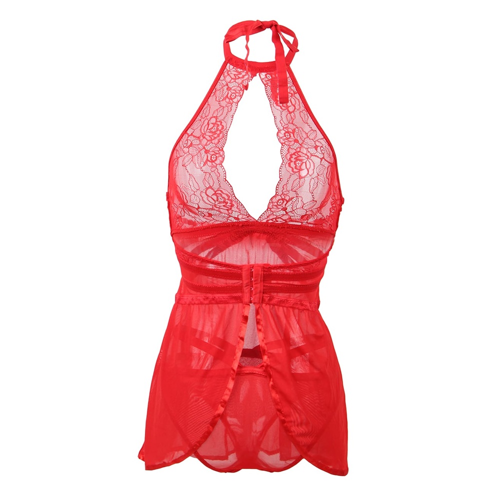 Wrap your curves in this sexy red babydoll with matching thong. A must have piece of your lingerie collection. Soft flyaway mesh chemise with floral lace cups. The Floral lace cups with deep V cutout at the front will highlight the roundness of your breasts.