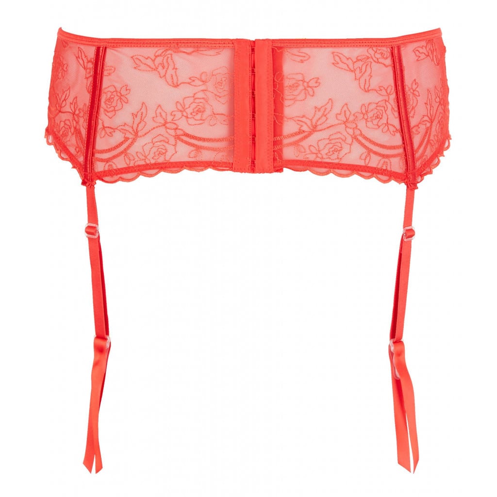 Suspender belt with four adjustable straps and a hook-and-eye closure. Delicately embroidered red transparency.