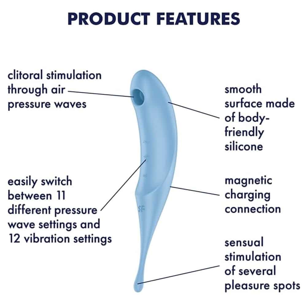 Satisfyer Twirling Pro Hybrid Air Pulse Vibrator Blue with two superstar functions. One convenient device!! Welcome to the wonderful world of hybrid Air-Pulse vibrators, with the all-new Twirling Pro! Take the powerfully targeted power of a tip vibrator, combine it with revolutionary Air-Pulse technology, and get a vibe that can do it all. With this clitoral vibrator, you get twice the bang for your buck. The Satisfyer Twirling Pro can be used on both sides: one for a vibrating sensation and one for sensational air pressure stimulation.
