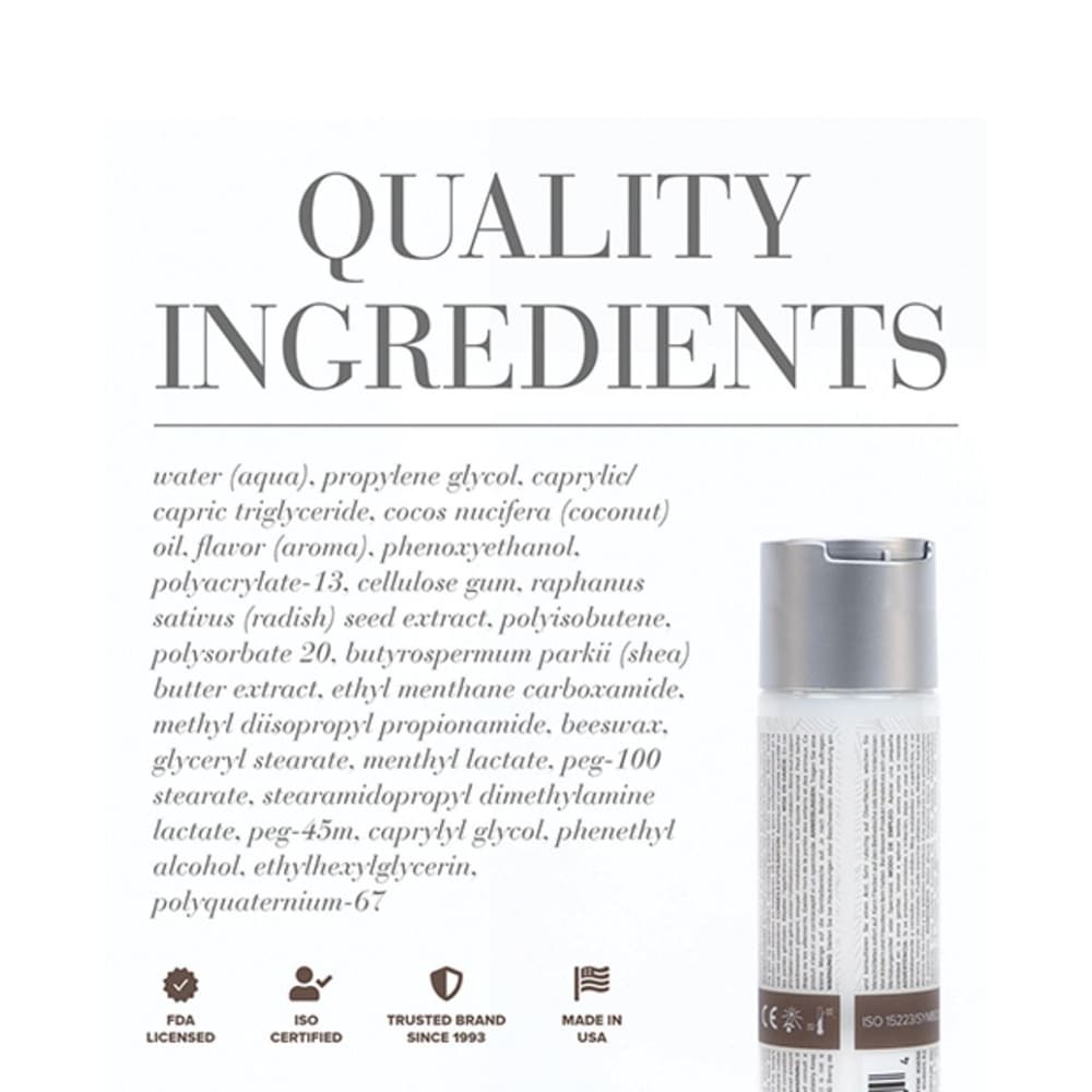 Formulated with Cocos Nucifera (Coconut) Oil, a natural antioxidant and moisturizer. Not compatible with polyurethane condoms, but safe for use with latex, rubber, and silicone materials.