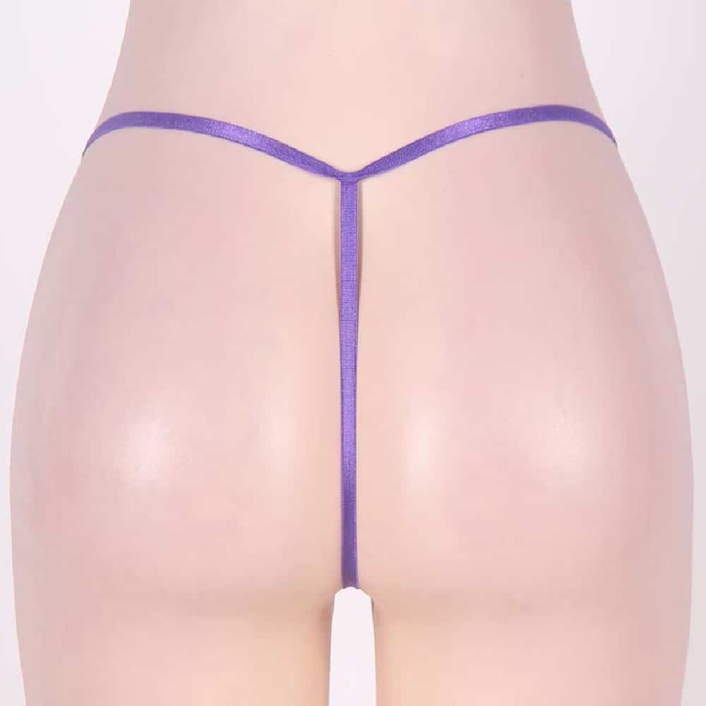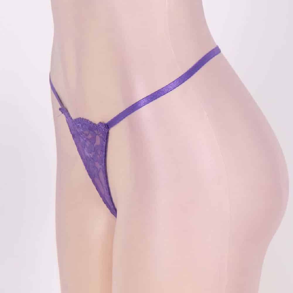 Item number: ETETP5111-3Tiny purple floral lace g-string with triangle transparent front and slender, low rise waist band. Tiny piece of lingerie for woman with big plans. The string is comfortable wear all day as well.