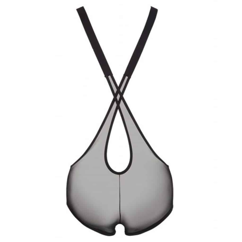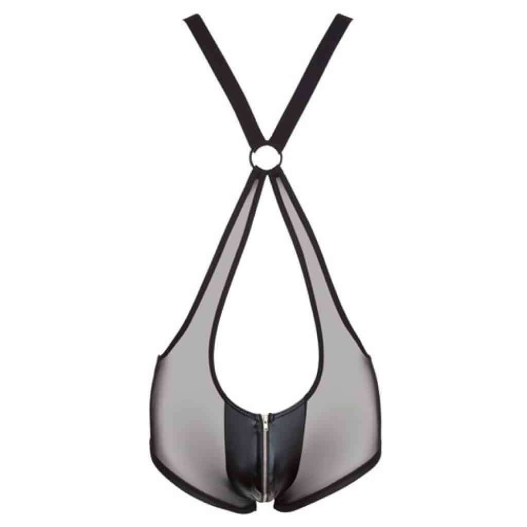 Black transparent powernet wrestler body with wetlook pouch. The shoulder straps are made of stretchy elastic covered in fabric. At the front there is a decorative metal ring. Over the pouch with padded zipper.